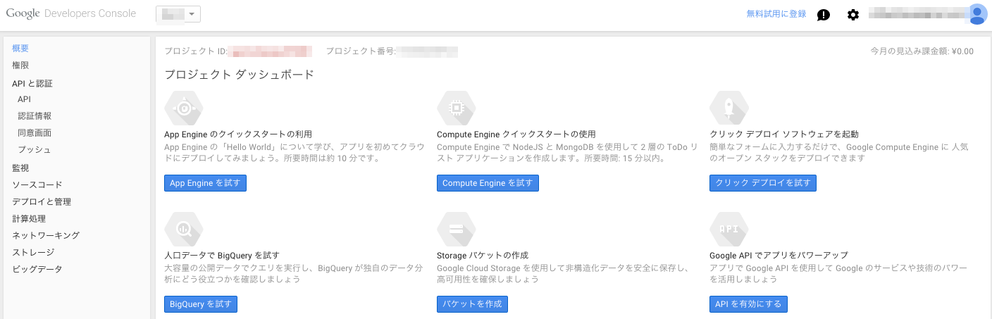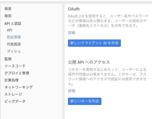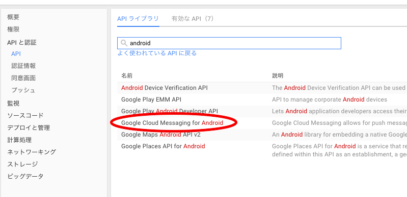 google play developer console と google developers console は別物。 とても紛らわしい google play developer console https://play.google.com/ google developers console https://console.developers.google.com/ 0. google play developer consoleで、アプリを作成 これは済んでいる前提。 アプリ名もストアに並ぶものそのままで書いている。 1. google developers consoleで、プロジェクトを作成。プロジェクト名はアプリ名と同じが良いだろう。ただし英数字しか使えない 2. PUSH通知サービスを有効にする。 左タブ「APIと認証」を選択→APIを選択→「Google Cloud Messaging for Android」を有効にする 3. 左タブ「APIと認証」→認証情報から、「公開 API へのアクセス」の「新しいキーを作成」をクリック。 テスト用にIPアドレスは 「0.0.0.0/0」としておく。 すると、「API キー」が発行される。 4. google play developer console に移動 5. アプリの「サービスとAPI」を選択→「GOOGLE クラウド メッセージング(GCM)」を作成。 先ほどの「APIキー」を入力。 すると「リンクしている送信者ID」が作成される (appCCloud使用の場合は不要の手順) appCCloudの場合 1. google developers consoleのみ使用。 appCCloudの管理画面に行き APIキーに「APIキー」を、 SenderIDに「プロジェクトID」(consoleの「概要」タブから確認)を入力 2. appc_cloud_x.x.x.jarファイルをプロジェクトに追加 3. AndroidManifest.xmlにappCCloud周りの必要事項を追記。 管理画面に書き方参考があるので、それを見てそのまま追記すればよい 4. コード記述。 MainActivity.javaに以下の3行を追記するだけ