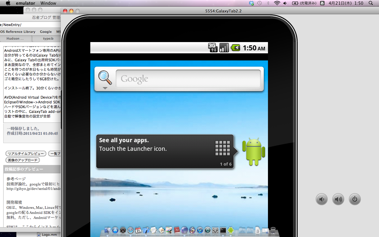 で、Startボタンを押下すると、別ウィンドウが開き、Android(GalaxyTab)の画面が開いた。