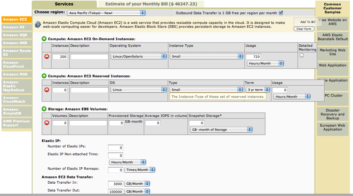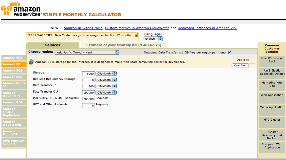 サーバだってある程度はストレージなんじゃないの? 何もデータを持たずにサーバの機能は果たせないんだから。 どこからs3を使うべき? (答えは下の料金表に。インスタンスのサイズに依って、Diskサイズが決まっている。それを超える容量が必要なら、S3の出番) 疑問2 サーバ(インスタンス)はどれくらいがんばれる? つまり、1インスタンスでどれくらいのアクセスを捌けるのか。 答え Smallインスタンスで月間100万PVくらいいけるらしい。参考ページ インスタンス=仮想サーバの実体 1インスタンス=1サーバ 料金(すべて東京リージョン。一部省略) http://aws.amazon.com/jp/ec2/#pricing http://aws.amazon.com/jp/s3/#pricing ec2にかかる料金 インスタンス稼働時間 Small(160GB) $0.10 / hour Large(850GB) $0.40 / hour ExLarge(1690GB) $0.80 / hour (他にもあるけど省略) サーバへの転送(転入) $0.10 / GB サーバからの転送(転出) $0.20 / GB(10TBまで) $0.15 / GB(10〜50TBまで) $0.14 / GB(50〜150TBまで) $0.13 / GB(150TB以降) S3にかかる料金 使用量 $0.135 / GB(50TBまで) $0.120 / GB(50〜500TBまで) $0.105 / GB(500〜1000TBまで) $0.095 / GB(1000〜5000TBまで) $0.065 / GB(5000TB以上) 転入量 $0.10 / GB 転出量 $0.201 / GB(10TBまで) $0.158 / GB(10〜50TBまで) $0.137 / GB(50〜150TBまで) $0.127 / GB(150TB以上) PUT,POST,LISTリクエスト $0.01 / 1000req GET,そのたリクエスト $0.01 / 10000req 概算してみよう ぐるなびのようなサイトを想定。 サイト概要 ・月間2億ページビュー ・店舗数500,000 ・店舗数毎月10,000増 必要な数字 ・1店あたりのデータ量 10MB(画像ファイル10枚とか) ・サイトのデータ総量 5,000GB=10MB×500,000店 ・データ追加総量(新規出店とか、コメント追加) 100GB=10MB×10,000店 + 10KB×100,000コメント ・データリクエスト送信 2億リクエスト=2億ページビュー ・データダウンロード 2億リクエスト 料金 ・ec2インスタンス稼働時間 Smallインスタンス200台(2億PVで100万PV/1Smallインスタンス) $14,400=$0.10/hour × 720時間 × 200台 ・ec2転入 3,000GB = 30KB×1億回リクエスト(1リクエストのデータ量を30KBとしてみる) $300 = $0.10/GB × 3,000GB ・ec2転出 100,000GB = 500KB × 2億回リクエスト(1リクエストの結果の取得データを平均500KBとしてみる) $15,000 = $0.20/GB × 10,000GB + $0.15/GB × 40,000GB + $0.14/GB × 50,000GB ・S3使用量 $750 = $0.15/GB × 5,000GB(サイトのデータ総量) ・S3転入量 $10 = $0.10/GB × 100GB(データ追加総量) ・S3転出量 100,000GB(ec2転出と同量としてみる) $15,180 = $0.201/GB × 10,000GB + $0.158/GB × 40,000GB + $13,700/GB × 50,000GB ・PUT,POST,LISTリクエスト $2,000 = $0.01/1000リクエスト × 2億リクエスト 総計 $44,000/月くらい 本当かな? アヤシイ… 公式でも計算してみた だいたい合ってるようだけど、そもそもの見積もりが正確かどうかあやしい。 S3とec2間のデータ転送は無料らしいから、S3転出量のところは考えなくても良いのかも?(S3→EC2→外だから) だとすると、$29,000/月になる。 S3には各店舗の情報(テキスト、画像ファイルとか)が入っているとして、 ec2には何が入る…? サイトを作るのに必要なもの…だとしたら、phpとかが並んでるだけとか? PR |