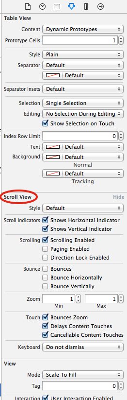 という感じで設定すれば良い。 そうすると他のコード中でもrowHeightが使えるようになり、 - (CGFloat)tableView:(UITableView *)tableView heightForRowAtIndexPath:(NSIndexPath *)indexPath; をオーバーライドしなくてもよくなる。 セル高さが常に同じなら、tableView:heightForRowAtIndexPath: を実装するより、rowHeightを定義したほうが早い。と思う。 他に estimatedRowHeight というプロパティもある。 詳しくは テーブルビューの中身のサイズテーブルビューはスクロールビューでもある。つまり、UITableViewはUIScrollViewの子クラスである。 だから、UIScrollViewで使えるプロパティやメソッドはUITableViewでも使える。 ストーリーボードでも設定項目がちゃんとある。 だから、テーブルビューのセルとセクションを含めた中身全体のサイズは、