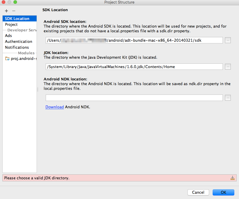 Project Structureを見ると、ご丁寧にNDKのダウンロードができるようになっている。 クリックして、ダウンロードする(10分ほどかかる) すると、自動的にディレクトリがセットされる (ダウンロードディレクトリは、ANDROID_SDK_ROOT/ndk-bundle になる) このディレクトリをbash_profileのNDK_ROOTに書き、 $ source ~/.bash_profile を実行すれば、ワーニングは消えた |