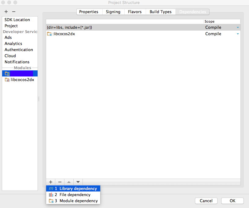cocos2d-x バージョン3.7 AndroidStudio バージョン1.3 (作業中に1.5.1にアップデート) AndroidStudioに対応したcocos2d-xのバージョンだと、プロジェクトのディレクトリに proj.android-studio/ が作られている。 まずはAndroidStudioを開いてみる ディレクトリは前述の場所を選択。 すると以下のエラーが出た どうやらJDKの指定が悪い様子。 JDKのパスを確認する方法は を選択。 すると以下のような画面になる 下部にエラー内容が書いてある。 "Please choose a valid JDK directory." つまり、以下のパスを修正しろということだ /System/Library/Java/JavaVirtualMachine/1.6.0.jdk/Contents/Home このパスが間違っているわけではないはずなのだが(Eclipseの時はこれで動いていたので) 変えた方が良さそうだ。 ひとまずjdkの最新をダウンロードしてみる。 ダウンロードページ ダウンロードされた場所は以下。 /Library/Java/JavaVirtualMachines/jdk1.8.0_73.jdk/Contents/Home このパスを指定すると、エラーが消えた。 ついでに、Android SDK のパスも変更。 adt-bundle-mac-x86_64-20140321 になっているが、昔のeclipseのダウンロードした時のままなのであまりふさわしくない (中にAPI level別のディレクトリが入っているし) 変更。 この場合、 ~/.bash_profile の中身の ANDROID_SDK_ROOT を書き換え、 $ source ~/.bash_profile を実行する。 また、ポップアップに従って、AndroidStudioをアップデートした。 次に、 Android.mkの指定をする必要がある。 LOCAL_SRC_FILESの部分は変更が必須。 Classesディレクトリ以下のすべての.cppと.hを正しくビルドに含めるために、以下のように記述。