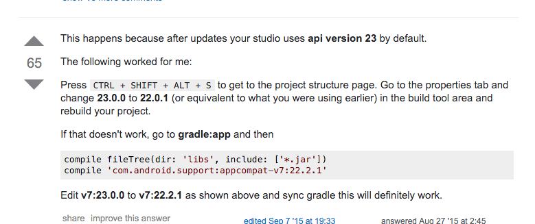 に書き換えると、できるようになる。 参考ページ 指定できるライブラリ一覧 ライブラリを追加する方法は で選択。 決定すると、自動でダウンロード、ビルドされる。 また、build.gradleにも自動で書き込まれている。 しかし、これもエラーが。 No resource found the matches the given name 'android:TextAppearance.Material.Widget.Button.Inverse' 原因は、APIレベルがあっていないことらしい 以下の対応をしたら直った ・Project Structureウィザードで、プロジェクトのBuildToolVersionを23.0以上にする ・build.gradleに以下を記述 compile 'com.android.support:support-v4:23.1.1' 参考 これらを対応してようやっとビルドに成功。 しかしまだ気になるワーニングがある