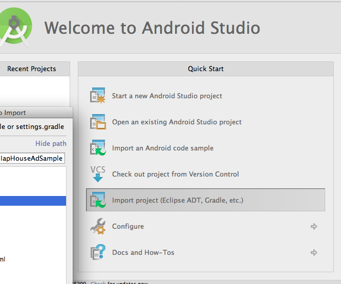 ずっとEclipse+ADTでやってきたが、これを機にやっとこさAndroidStudioに入る。 こういうきっかけがないとなかなか始めない(今まで作ってきたゲームの改良続きだと、環境を変えないでも十分すぐに作れてしまうし) というわけでまずはダウンロード。 パッケージが展開されるところまでは問題ないだろう。 Android Studioを起動するとWelcome画面になる。 今回は、gradleを使用したサンプルプロジェクトが用意されていたので、 以下のように、gradleプロジェクトをインポートする。 選択するディレクトリはココ。 appやgradleディレクトリ、settings.gradleの1つ上。 すると、こんな感じでプロジェクトが開く。 ちなみに赤丸囲みのところ、初めは「Android」になっているが、 「Project」に変えておくと、実際のディレクトリ構造と同じように表示される。慣れるまではこちらのほうがよさそうだ。ディレクトリ追加などもここからできるようになる。 さて、さっそくビルドしようとすると(というかバックグラウンドで勝手にビルドしてる) いくつかエラーが発生。 うむ。SDKのandroid-22がないと。 リンクを踏むと、勝手にインストールし始める。 簡単だ! Eclipseのときとは大違い。 再度ビルドするが、またエラー。 なるほど。ツールのほうもないと。 ではリンクを踏みましょう。 で完了。 うう〜ん、べんり! こんな感じで、エラーを解決させていけば、ビルドできた。 ちなみに、ビルド設定などは build.gradle に書く。 依存関係など。 見て分かるように、SDKバージョンもbuild.gradleに書くようになっている。 AndroidManifest.xml には書かない! とりあえず、いろいろ分かりやすくなっているぞ! |